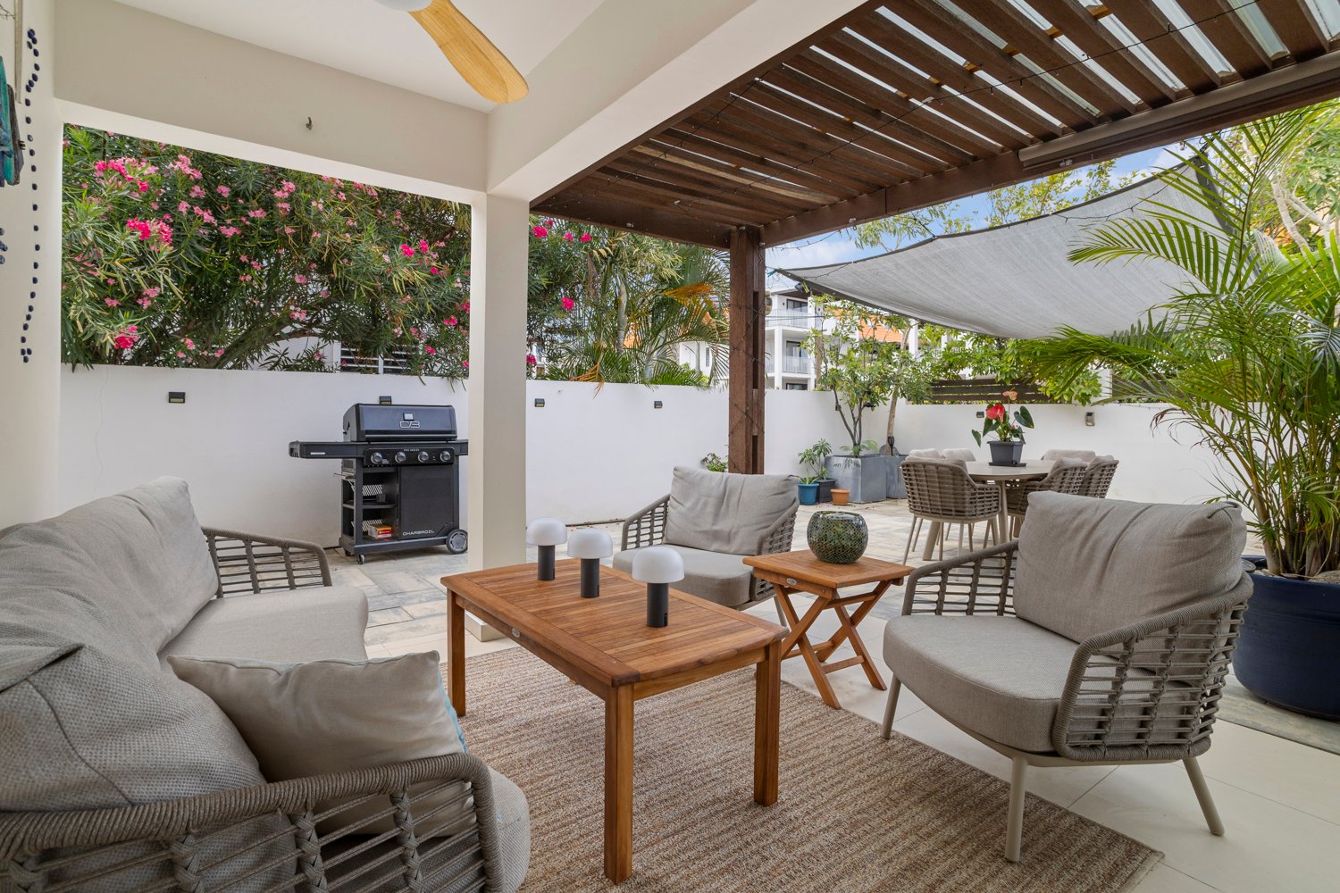 As you move through the open-plan layout, the indoors seamlessly transition outside. Open the door to your private covered terrace, where the island’s famous trade winds flow naturally through the home. Beyond the terrace lies a maintenance-free garden oasis, finished with elegant paver bricks and framed by extra-tall privacy fencing. It is a secluded, peaceful retreat perfect for quiet afternoons or alfresco dining under the stars—all without the worry of yard work.