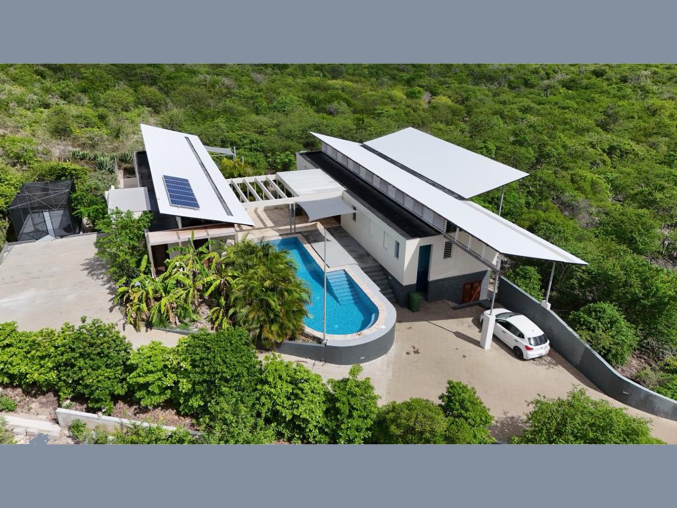 The residence has been designed for the tropics ‘on the wind’, using the trade wind as natural ventilation. The wind blows lovely through the rooms via glass shutters. As extra the rooms have ceiling ventilators in case of less windy days.