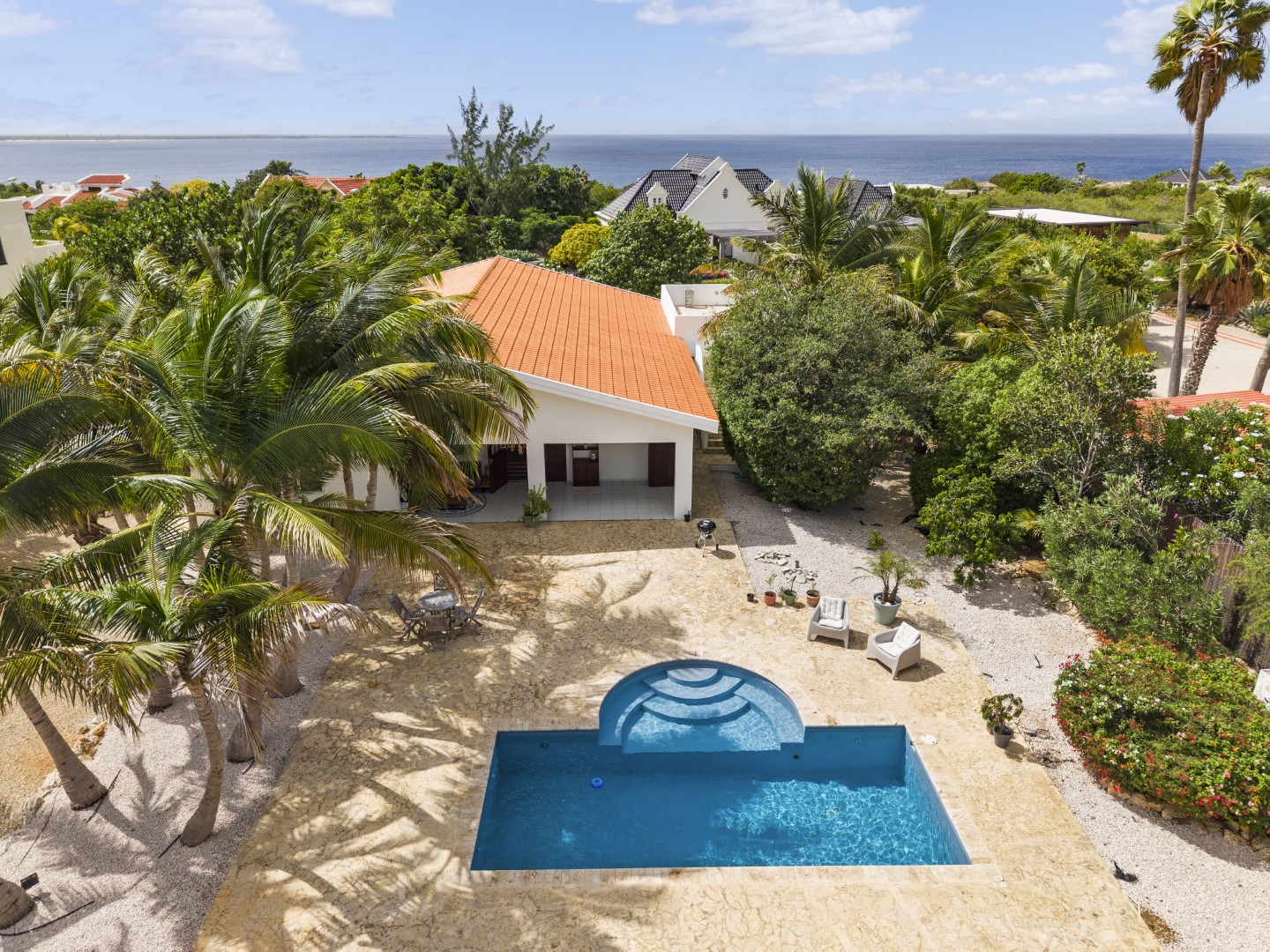 This villa is located in the third row from the sea in the quiet Sabadeco neighborhood, just a 10-minute drive from Kralendijk. The nearby Hato neighborhood offers several restaurants and a supermarket. For enthusiasts of snorkeling, diving, hiking, and mountain biking, there are plenty of opportunities within reach: the Wayaka walking trail, snorkeling in caves, mountain biking to Rincon, and the dive and snorkel sites Andrea, Oil Slick Leap, and Thousand Steps.