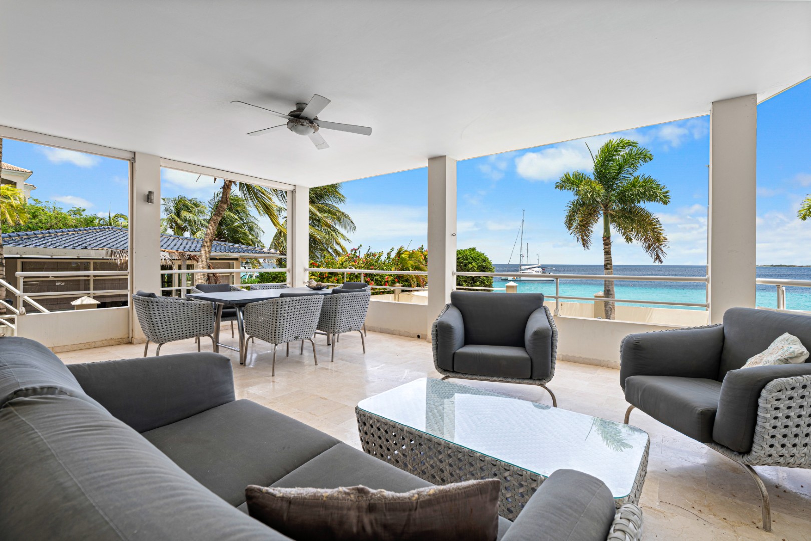 This luxurious seaside apartment is located on the boulevard just outside the center of Kralendijk. It is within walking distance of restaurants and bars, as well as beaches and popular dive sites. Sea Side Suites comprises six apartments, with two units on each floor. A private parking garage is located underneath the building, offering two designated parking spaces and a small storage unit for this apartment.